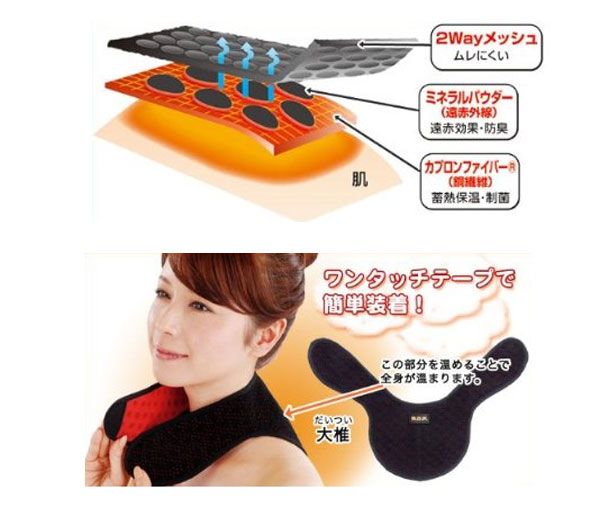 ミネラルパウダー(遠赤外線)+カプロンファイバー®(銅繊維)の蓄熱保温W効果!!やはりパソコンを長時間やっていると、首や肩、背中までも痛くなります。