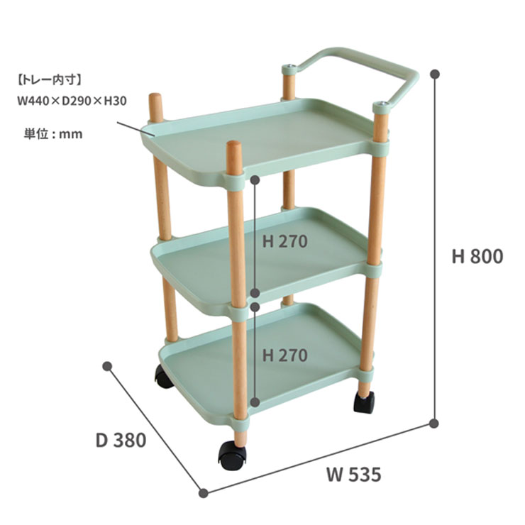 商品サイズ 幅53.5×奥行38×高さ80cm 材質 トレー・取っ手:ポリプロピレン 支柱:天然木(ビーチ材) 商品詳細 組立品 各棚耐荷重:15kg 商品説明 トレイは深さが3cmあり、水分が溢れることなく拭き取ることができます。