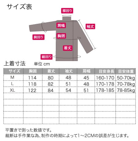 サイズ M L XL サイズスペック 胸囲 / 着丈 / 袖丈 / 肩幅 / 目安身長 / 目安体重 ◆M (cm) :114 / 80 / 48 / 45 / 160-170 / 50〜70kg ◆L (cm) :118 / 82 / 51 / 48 / 170-178 / 70〜78kg ◆XL (cm):122 / 84 / 54 / 51 / 178-185 / 78〜85kg ※サイズは実寸寸法のため多少の誤差が生じますが、ご了承の程、よろしくお願いします。